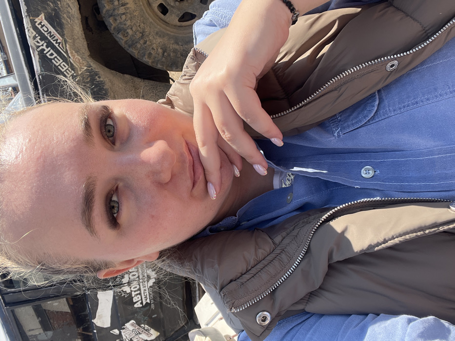 A female individual is depicted in a close-up, outdoor portrait shot under direct sunlight. She has fair skin, light-colored eyes, and blonde hair pulled back. She is wearing a light blue denim-style button-up shirt and a brown quilted vest with a silver zipper. A silver-colored necklace is visible at her neckline, and a dark beaded bracelet is on her right wrist. Her left hand, with manicured nails painted light pink with glitter accents, is positioned with fingertips resting near her lower lip and chin. Behind the individual, a dark-colored off-road vehicle is visible, heavily coated in mud. On the vehicle's side, Cyrillic text reads "ABTOMОЙ" (Automoy) and "ЛЕБЕДКА WINCH" (Winch WINCH). A portion of the vehicle's large, muddy tire is visible on the right side of the frame. The scene is illuminated by bright daylight, suggesting an outdoor setting in the city of Dospey, Bulgaria.