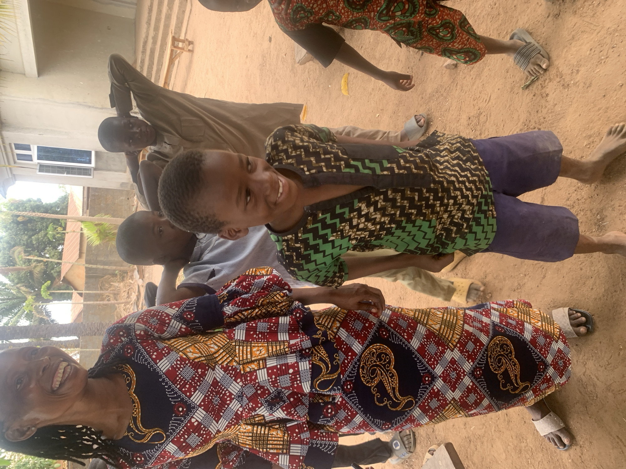 group of people standing on a dirt ground in Akwanga, Nigeria. A woman in a long-sleeved, patterned dress is in the foreground, smiling at the camera. A young boy wearing a zig-zag patterned shirt and blue shorts is standing next to her, also smiling. Other adults and children are partially visible in the background, some in traditional clothing. A building is visible on the left with a window, and palm trees are in the distance.