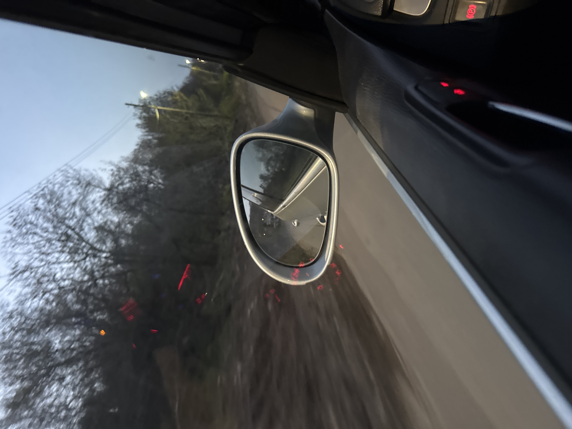 view from inside a car, looking out the passenger side window. The side mirror is prominently visible. The reflection in the mirror shows a road and what appears to be a vehicle behind. Outside the car window, there are trees and vegetation, with a glimpse of the sky. The interior of the car features the door panel with some buttons and the emergency brake indicator light illuminated. The setting appears to be rural, possibly on the outskirts of a town, but not specifically identifiable as Atiya, Bulgaria based on the visual information.