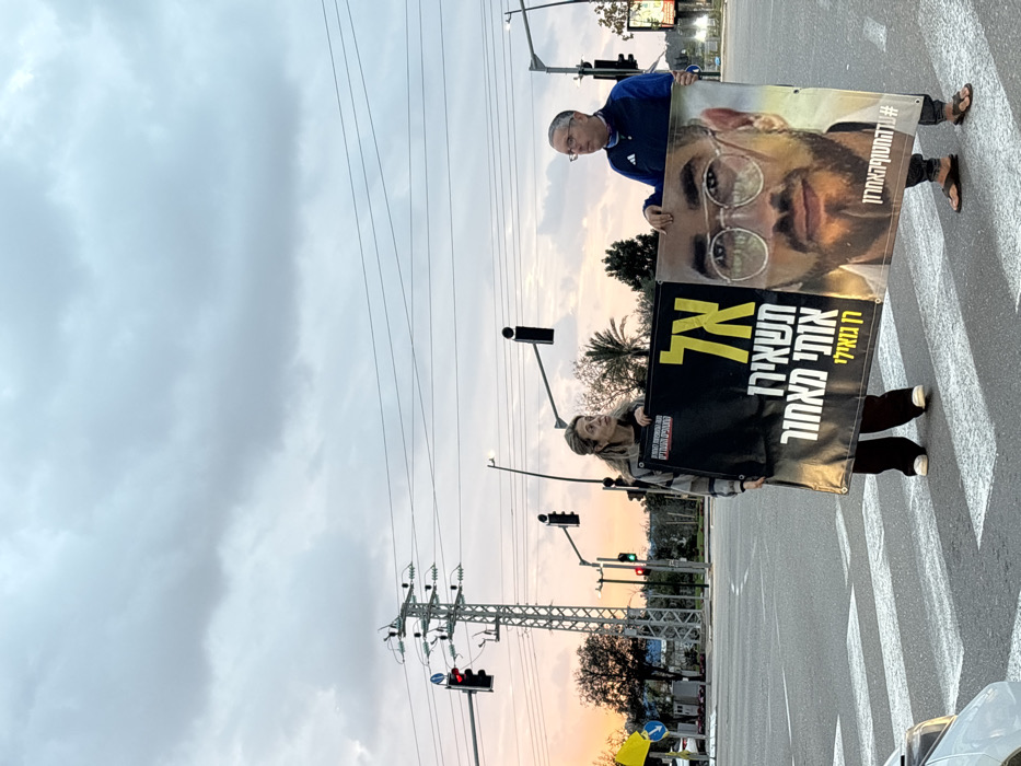 - "At an urban intersection in Ramat HaSharon, Israel, at dusk or dawn under an overcast sky, two middle-aged individuals stand within a crosswalk, holding two conjoined protest banners" by FM-mfRp53, licensed under CC BY 4.0