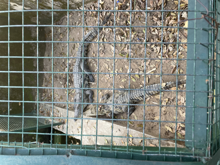 The image presents an overhead view into an outdoor animal enclosure, consistent with a zoological garden such as the National Children's Park and Zoo in Abuja, Nigeria. A green metal mesh fence, featuring a square grid pattern, partially obscures the foreground. Within the enclosure, two crocodiles are observed resting on a dirt ground heavily littered with dry brown leaves. The first crocodile, positioned in the upper right quadrant of the frame, lies with its head facing left. The second crocodile is situated in the lower left, oriented with its head away from the camera; a distinct reddish-brown, possibly raised, lesion is visible on its upper back/neck area. The enclosure's left boundary includes a concrete structure adjacent to a dark green body of water. No human subjects or discernible actions are present.