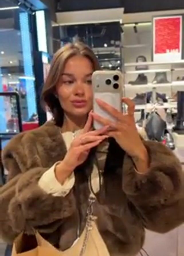 A woman in a brown faux fur coat is taking a selfie in a store. She has brown hair with lighter streaks, a fair complexion, and light pink lipstick. She is holding a smartphone in a light-colored case and has a beige purse hanging from her shoulder. The store appears to sell shoes; shelves of shoes are visible in the background. A shopping bag sits on a counter in front of her. The lighting is bright, suggesting a modern retail environment.