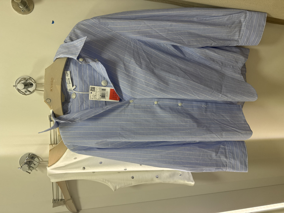- "A light blue and white striped button-up shirt hangs on a Mango brand hanger attached to a metal clothing rack on a white wall" by FM-KwP182, licensed under CC BY 4.0