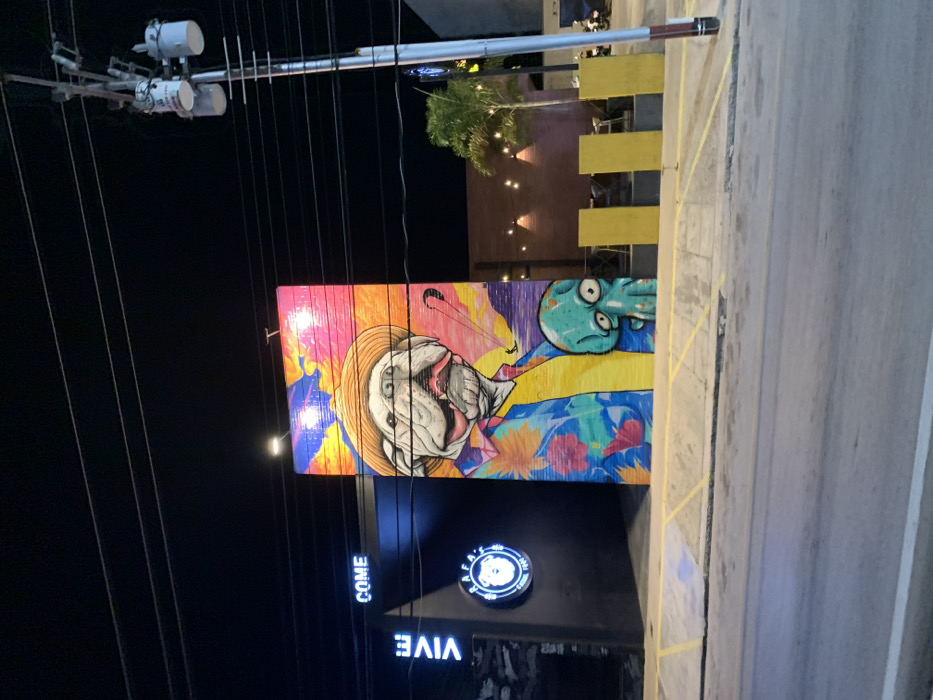A colorful mural adorns a building, featuring a dog with a hat and an alien-like creature. Below, neon signs read "COME" and "VIVE" above a logo. Above the mural are power lines and other structures. To the side is a sidewalk with yellow lines. In the background is a partially obscured structure with lights and plants. The overall scene is at night.