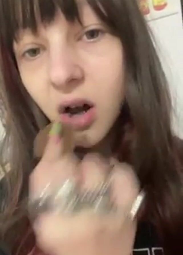 A young woman with brown hair and bangs, wearing a black t-shirt and silver necklaces, is eating a piece of chocolate. She has multiple rings on her fingers, some with red stones. Her nails are painted different colors. The background is a white wall with a food-related sticker. She finishes the chocolate and holds it up for the camera.