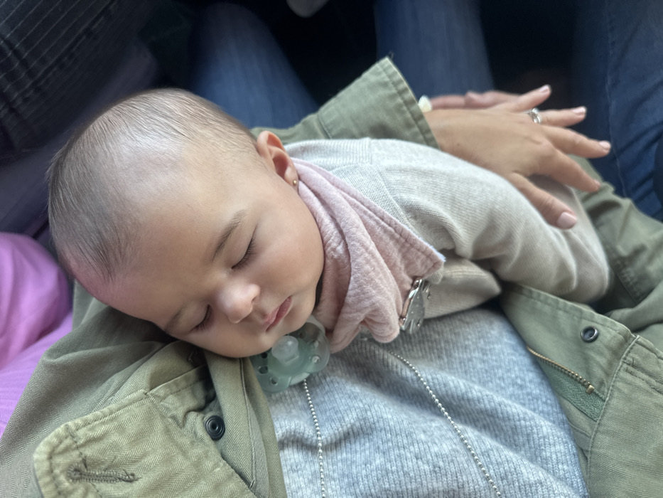 A sleeping baby rests on a person's chest, pacifier in mouth, and gold earrings visible