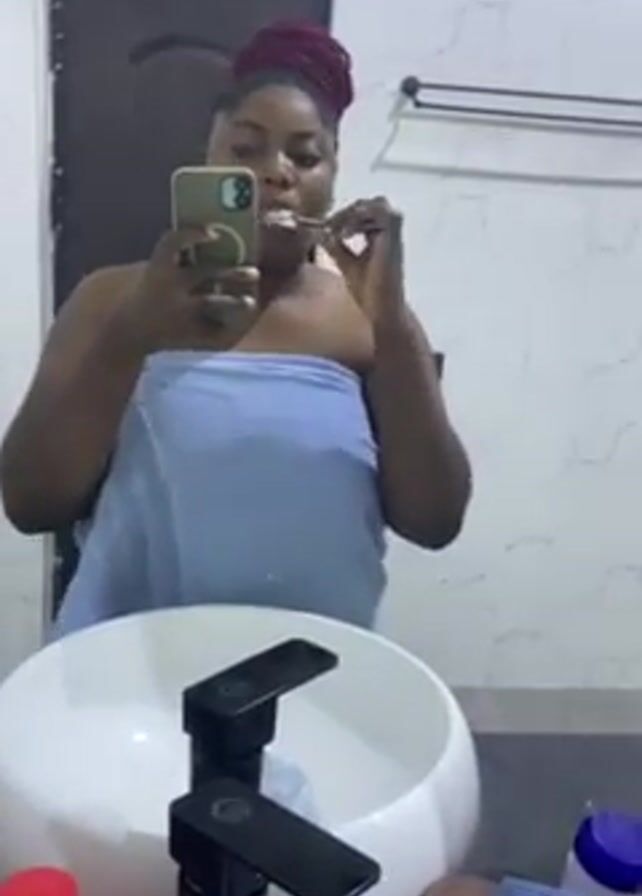 A woman stands in a bathroom in front of a mirror, brushing her teeth. She's wrapped in a light blue towel, and her hair is styled in an updo. She holds a smartphone in her left hand, presumably to record herself. In front of her is a white, round sink with two black faucets. Various toiletries and personal care items are visible on the counter around the sink. The bathroom has light-colored walls with a marble-like pattern, and a towel rack is visible on the wall behind her. A dark door is visible in the background to the left.