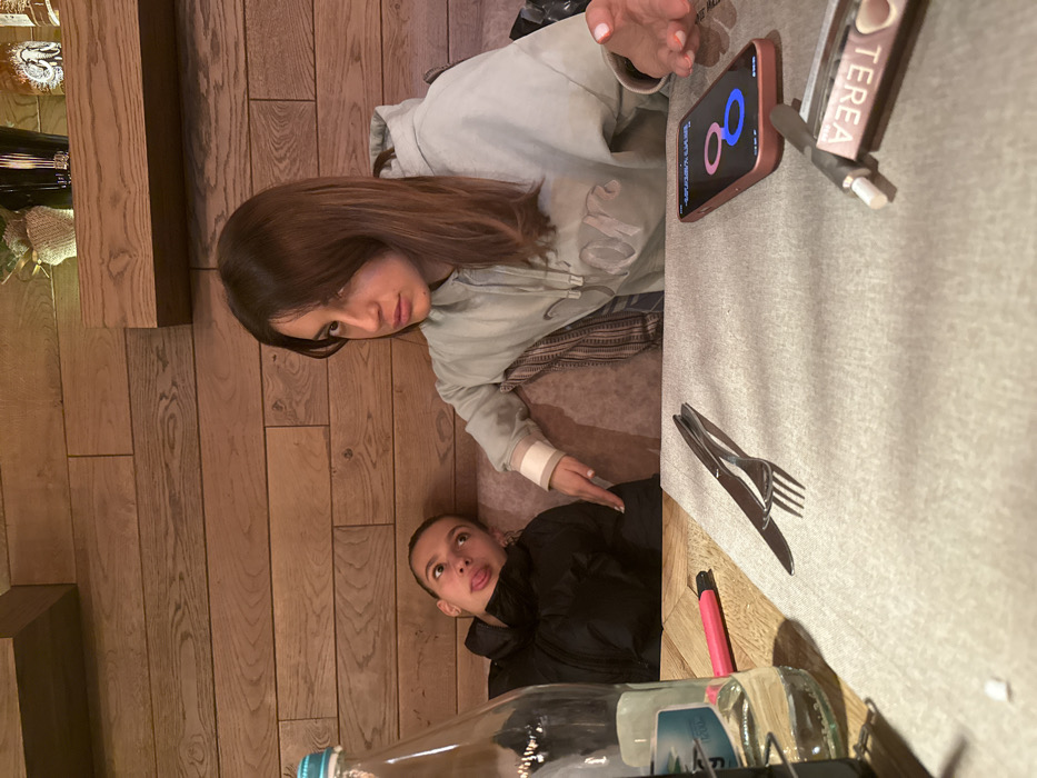 The scene captures two young adult females seated at a booth table within a casual dining establishment in Sofia, Bulgaria