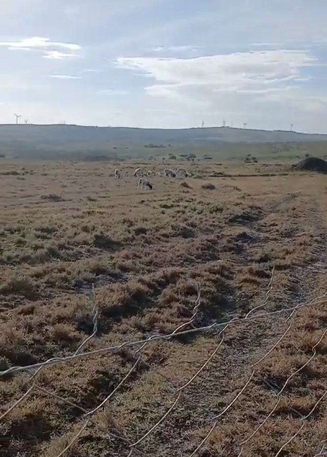 field with sparse vegetation, seen through a wire fence. In the distance, a flock of sheep is grazing. On the horizon, there are rolling hills and wind turbines are visible against a cloudy sky. The general atmosphere suggests a rural or agricultural setting.