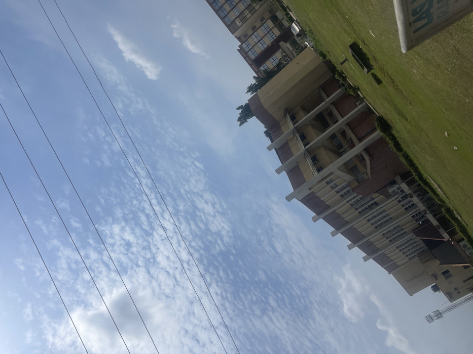 The image displays a daytime view of the University of Lagos (UNILAG) campus, located in Akoka, Yaba, Lagos, Nigeria. The upper two-thirds of the frame is dominated by a bright blue sky with numerous scattered white, patchy clouds. Five dark, parallel overhead lines, consistent with power or communication cables, traverse the sky diagonally from the top-left towards the bottom-right. In the mid-ground, a prominent multi-story building, likely an academic or administrative structure, features a facade composed of light beige and reddish-brown sections, accented by distinctive vertical concrete fins or columns. Numerous rectangular windows are visible across the building's exterior, some fitted with air conditioning units. To the right and slightly behind this primary structure, a second multi-story building with a grid of windows and a brownish facade is partially visible. A cluster of tall green trees stands between and behind these buildings. The lower third of the image shows a well-maintained green lawn extending from the foreground towards the buildings. Two dark, rectangular structures, possibly planters, are positioned on the lawn. A lattice-style communication tower with antennas is visible in the far bottom-left corner. In the bottom-right corner, a partially obscured white sign with dark lettering displays the visible characters "LAG," indicative of "Lagos." No individuals, vehicles, or explicit activities are observed within the frame.
