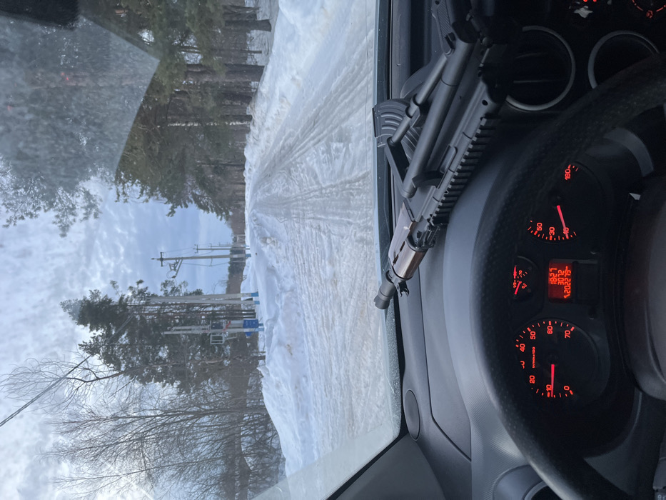The image depicts a snowy, forested rural road in Раздолье, Russia, viewed from inside a vehicle. A black assault rifle, consistent with an AK-style weapon, is positioned on the vehicle's dark-colored dashboard. The rifle features a brown wooden handguard, a ribbed magazine, and a folding stock. Below the dashboard, part of the steering wheel and a red-illuminated instrument cluster are visible, displaying "18:27" (time), "307.2" (trip), and "202275" (odometer). The exterior environment shows a snow-covered road with tire tracks, flanked by tall coniferous and bare deciduous trees. Utility poles with power lines line the left side of the road, some marked with blue and white sections. The sky is overcast. No individuals are visible.