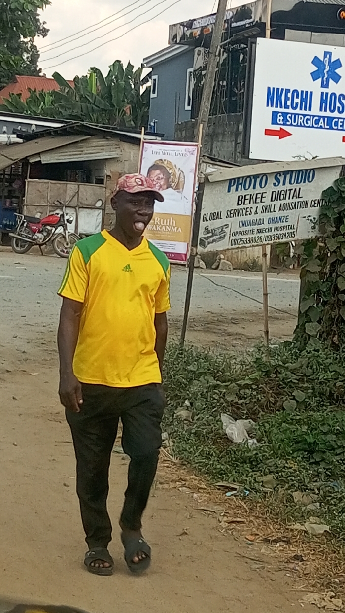 A man with his tongue out, wearing a yellow and green sports shirt, black pants, and sandals, is walking on a dirt road. In the background, a sign reads "PHOTO STUDIO BEKEE DIGITAL" along with contact information and "NKECHI HOS & SURGICAL CEN." A poster displays the words "LIFE WELL LIVED" above an image of Ruth Wakanma. A motorcycle is parked nearby, and there is a building with a shanty in the background. Green foliage and a utility pole are also visible.