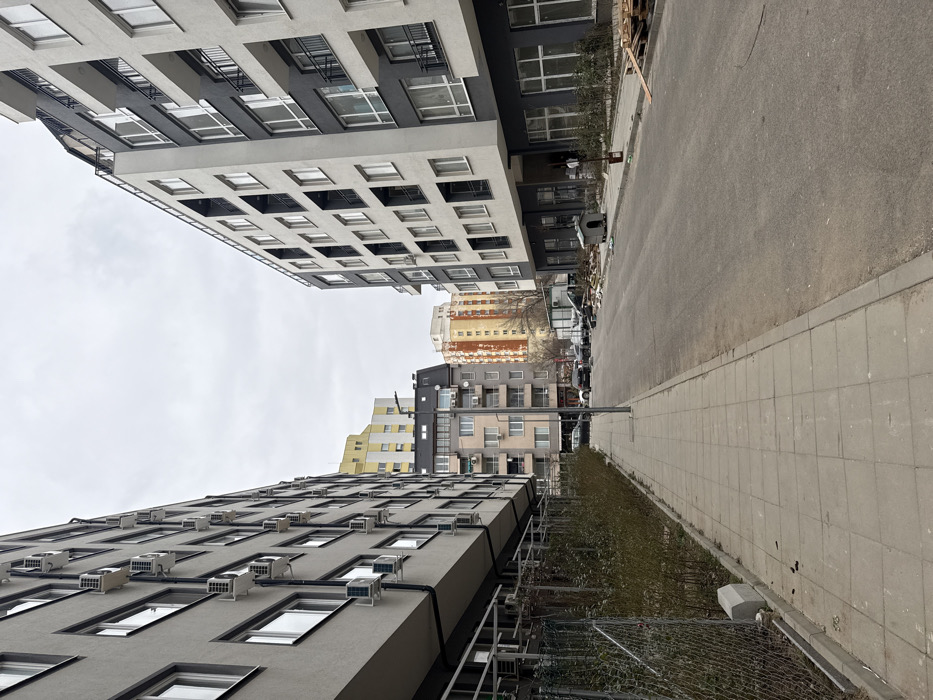 The image depicts an urban residential street scene in Sofia, Bulgaria, under an overcast sky. The street runs from the foreground into the mid-distance, flanked by multi-story residential buildings. On the left, a modern apartment building with a light grey facade and white-framed windows extends upwards and into the distance. Numerous white external air conditioning units are mounted below most windows along its visible length. The ground level features a dark grey fascia. A paved concrete sidewalk runs parallel to this building, separated from the street by a curb. Between the sidewalk and the building, a narrow strip of ground with sparse, low-lying shrubs is enclosed by a wire mesh fence, exhibiting some construction-related material, including a small concrete block. On the right, another modern multi-story apartment building with a two-tone facade (white and dark grey) features multiple balconies with dark railings and large windows. Its ground floor appears to contain unfinished commercial or residential units with extensive glazing. Adjacent to this building, on the street level, is a collection of construction debris, including wooden pallets and general rubble. A brown, rectangular doghouse is positioned on the asphalt near this debris, with what appears to be an overturned trash receptacle nearby. The asphalt street itself is free of markings and appears to be a local access road. In the mid-ground, a modern street light pole stands to the left of the street's center. Several parked vehicles are visible further down the street. In the background, beyond the immediate buildings, a mix of older residential blocks and taller structures is visible. Towards the center-left, an older, light beige or pink multi-story apartment building is distinguishable, also featuring multiple external air conditioning units. Further back, a taller, yellow and grey apartment building is visible on the left, and a taller, orange and brown building is seen on the right. No individuals or active interactions are visible in the scene. The overall environment suggests a residential area undergoing continued development or recent construction.