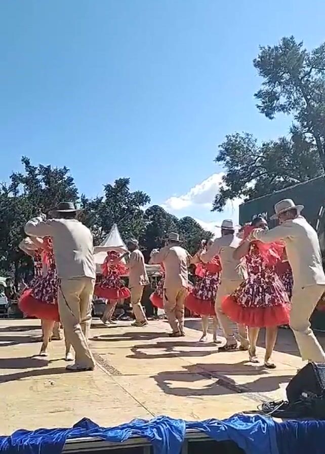 A group of ten dancers perform on a wooden stage outside on a sunny day. The dancers consist of five men and five women. The men wear light tan pants and shirts with dark hats. The women wear bright, colorful dresses with large red ruffles. They are performing a dance that involves pairs, with the men and women holding hands and spinning. The camera is placed below the stage, looking up at the dancers. In the background, there are trees and a white tent. A large banner with green print is also visible in the background. The stage is decorated with a blue fabric draped along the front. The video provides a clear view of the dancers and their performance.