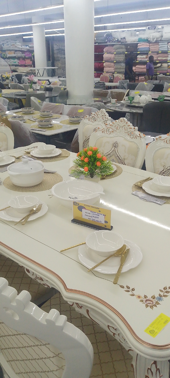The image depicts the interior of a furniture and home goods retail store located in Mkomani ward, Kenya. The scene focuses on a display area featuring multiple dining sets under bright overhead fluorescent lighting. In the immediate foreground, an ornate, off-white dining table with a glossy finish and decorative gold/bronze trim is prominently displayed. The table surface is adorned with subtle floral motifs. It is set with several individual place settings, each comprising a white ceramic plate, a bowl, and gold-colored textured cutlery (forks, spoons, knives) atop round, woven golden placemats. A white lidded tureen and a larger white serving bowl are also part of the display. A small artificial plant with green leaves and orange berry-like clusters serves as a centerpiece. A clear plastic display stand in the mid-right foreground presents a price tag from "CHINA SQUARE" for a "WOODEN DINING TABLE," "NAME: 1+8 CHAIRS," "ITEM NO: CT109," priced at "KSH: 215,000/-." Matching ornate, high-backed dining chairs with off-white frames and patterned upholstery surround the table. In the mid-ground, several other dining table displays are visible, many partially covered in clear protective plastic. One table features green glass goblets and white teacups with teapots. Large, white cylindrical support pillars rise towards the ceiling throughout the space. The background reveals tall shelving units stacked with neatly folded textile merchandise, including what appear to be towels or bedding, in various colors such as pink, blue, white, grey, and maroon. Two individuals are visible in the far background, near these shelving units. One person wears a dark shirt, and the other wears a lighter purple/blue shirt, both standing and appearing to browse the merchandise. The floor is tiled with a light-colored, possibly patterned, surface.