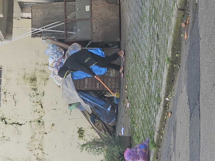 An individual is depicted sweeping a paved area in an outdoor scene located in Salé, Morocco. The person, dressed in a dark hooded jacket with a light stripe on the sleeve and dark trousers, wears red-strapped flip-flops. They are actively pushing an orange-handled broom with yellow bristles across the grey/green interlocking pavers, which have grass growing between them. Scattered small pieces of debris and litter are visible on the paved surface and along the adjacent concrete curb. To the left, a translucent purple plastic bag containing waste rests near a small potted plant. The paved area transitions to an asphalt road with a visible patched section. In the background, a light-colored wall with significant moss/algae growth, cracks, and staining forms the left boundary, with a horizontal barred window at its upper portion. To the right of the sweeping individual, a large accumulation of various items is present, including numerous clear plastic bottles (some appearing to contain liquid), blue tarpaulins, wooden planks, and discarded pieces of glass or clear panels, suggesting a storage or waste collection point.