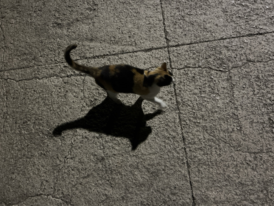 The scene is set on a concrete or asphalt surface in Rafailovići, Montenegro. A domestic cat, displaying a calico coat pattern of black, orange/brown, and white patches, is the central subject. The cat is captured in motion, positioned in the upper right quadrant of the image, moving towards the lower right. Its head is lowered, directed towards the ground, indicating an action of sniffing or close inspection. The tail is held upright and curved. A prominent, dark, elongated shadow of the cat is cast to its left, stretching across the rough, cracked concrete surface. The lighting conditions suggest an artificial light source, illuminating the cat and casting the sharp shadow, indicative of a nighttime or low-light environment. The ground itself is textured, uneven, and marked with several fine cracks and broader seams.