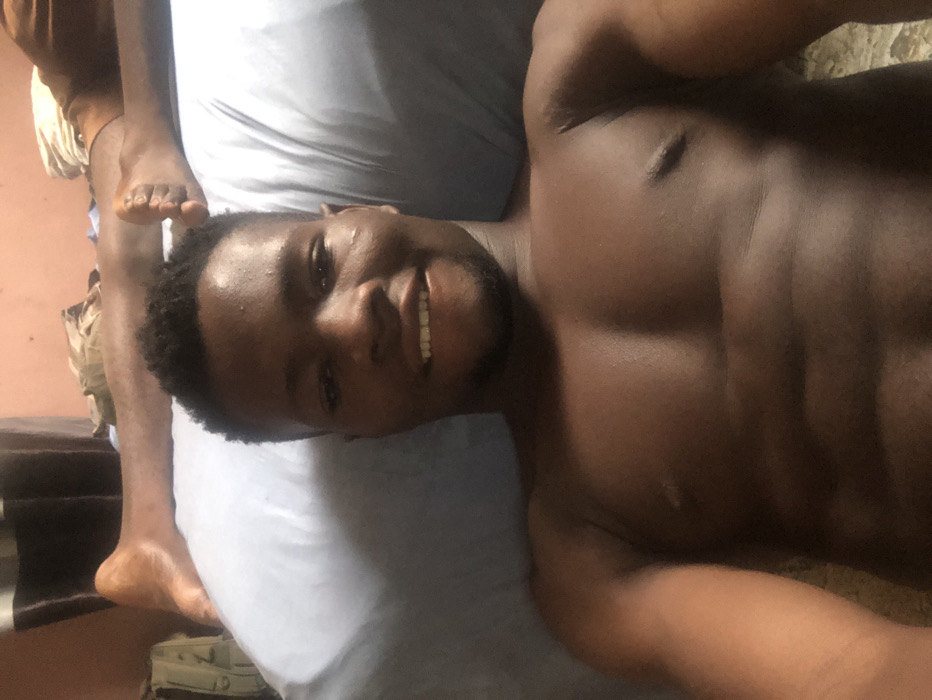 The image displays an indoor scene in the city of Aiyetoto-Asogun, Nigeria. The primary subject is a shirtless Black male with short, dark textured hair and a faint beard, smiling directly into the camera. He is shown from the mid-chest upward, appearing to recline. In the background, above his head and to the left, the lower legs and bare feet of a second individual are visible, resting on a light blue mattress or bedding. The second person's legs are clad in light-colored trousers. A dark bag is partially visible on the far left against a plain reddish-brown wall. The scene is dimly lit.