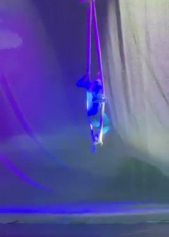 A performer in a blue and white bodysuit is suspended in the air by two purple silk fabrics, performing aerial acrobatics on a stage