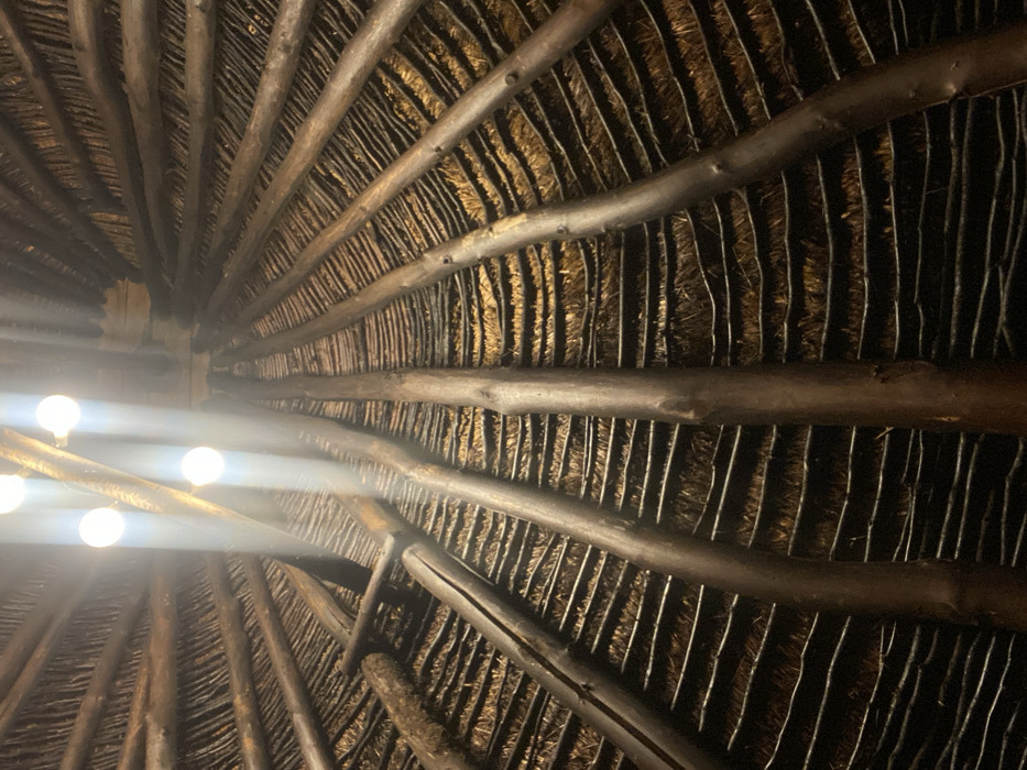 The image displays an upward-angled view of the interior ceiling of a circular or conical structure, located in Dulovine, Montenegro. The ceiling features a traditional thatched design, with layers of golden-brown straw or similar plant material laid between dark, roughly hewn wooden beams that radiate from a central point. Approximately four visible spherical light bulbs, emitting bright white light and producing prominent lens flares, are mounted near the apex of the ceiling, providing illumination to the interior. No individuals or specific actions are discernible within the frame.