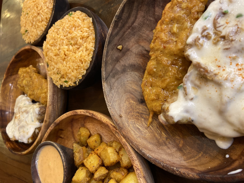 The image displays a close-up, elevated view of multiple food items arranged on a dark, polished table surface, likely in Dhaka, Bangladesh. No individuals are visible. In the foreground, a large, light-colored wooden bowl contains two distinct food items. One is a long, irregularly shaped item, yellowish-orange in color, possibly a skewer of marinated and cooked meat, exhibiting a textured, saucy surface. Adjacent to and partially beneath it, another food item is heavily coated in a thick, creamy white sauce, dusted with red-orange flakes. To the upper left, another light-colored wooden bowl is filled with numerous golden-brown, diced potatoes, appearing fried or roasted, with visible seasoning on their surfaces. Next to this bowl, a smaller, dark-colored wooden bowl holds a smooth, light orange, creamy sauce or dip. In the background, a third large, light-colored wooden bowl contains at least two items: one similar to the white-sauce-covered item in the foreground, and another piece coated in a yellowish-orange sauce, resembling the texture and color of chicken wings. To the right in the background, two small, dark-colored wooden bowls are present, each filled with orange-tinted rice, containing small green flecks, indicating herbs or vegetables. The table surface beneath the bowls displays a subtle wood grain and reflections.