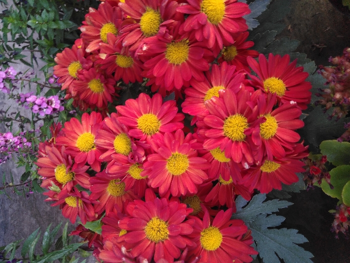 - "The image displays a dense cluster of approximately 30-40 red flowers, likely chrysanthemums, each exhibiting numerous vibrant red-orange ray florets encircling a prominent, textured yellow disc floret center" by FM-f4dh13, licensed under CC BY 4.0