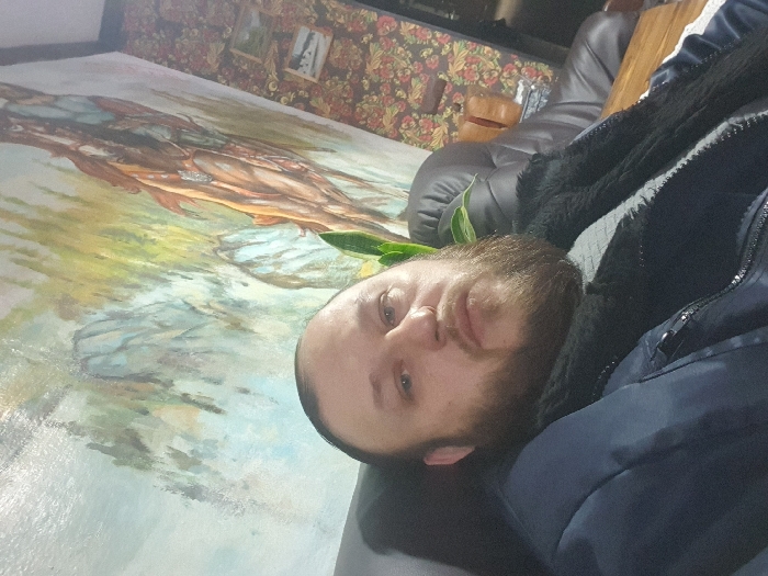 A man with a beard lies on a painting, facing the camera. He is wearing a dark blue jacket with a fur-lined collar. The painting features a figure, possibly a human or animal, with brown and orange hues. The background of the painting appears to be a landscape with water and vegetation. Behind the painting, there is a floral patterned wall. Also, one could observe some furniture behind the wall.