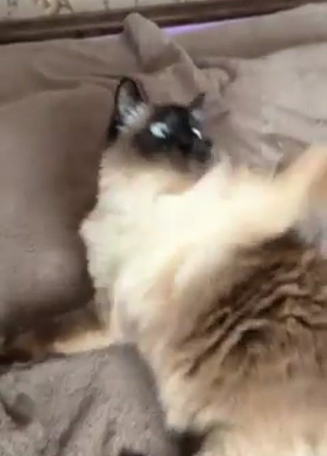 A tan and brown cat with blue eyes is lying on a brown blanket in a bedroom. The cat is playing with a pink ribbon that is being held by a person whose hand is visible in the frame. The camera moves in for a close up of the cat's face. The wall in the background has a floral pattern.