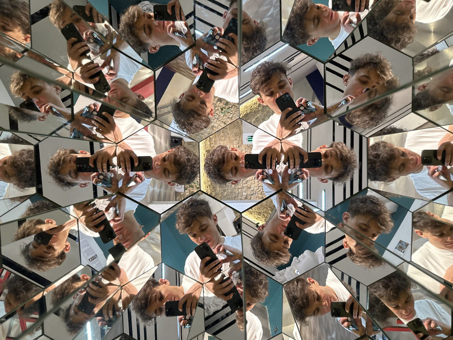 A young male subject is depicted in a kaleidoscopic mirror installation, resulting in multiple fragmented reflections of his image across hexagonal and triangular panels