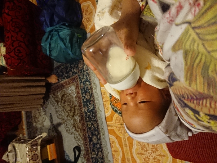 The image portrays an indoor scene located in Valenton, France. In the immediate foreground, an infant, wearing a light-colored hooded top, is lying down and being bottle-fed. An adult hand holds a clear glass baby bottle, containing a white liquid, to the infant's mouth. The infant's head is turned to its right, with eyes open. The infant rests on a colorful patterned fabric displaying yellow, green, and red motifs, partially covering a reddish cushion or surface. The background reveals a residential interior. The floor is covered with patterned yellow tiles, over which a patterned rug in dark blue, white, and red is partially laid. To the upper left, a small wooden table with a patterned tablecloth and a light brown rectangular object is visible. Adjacent to the table, the lower half of an adult, clad in a long light-brown skirt, stands barefoot on the rug. To the right of the adult, a portion of a red sofa or armchair with an ornate pattern is present. Two soft bags, one teal and one dark blue, rest on the tiled floor near the sofa.