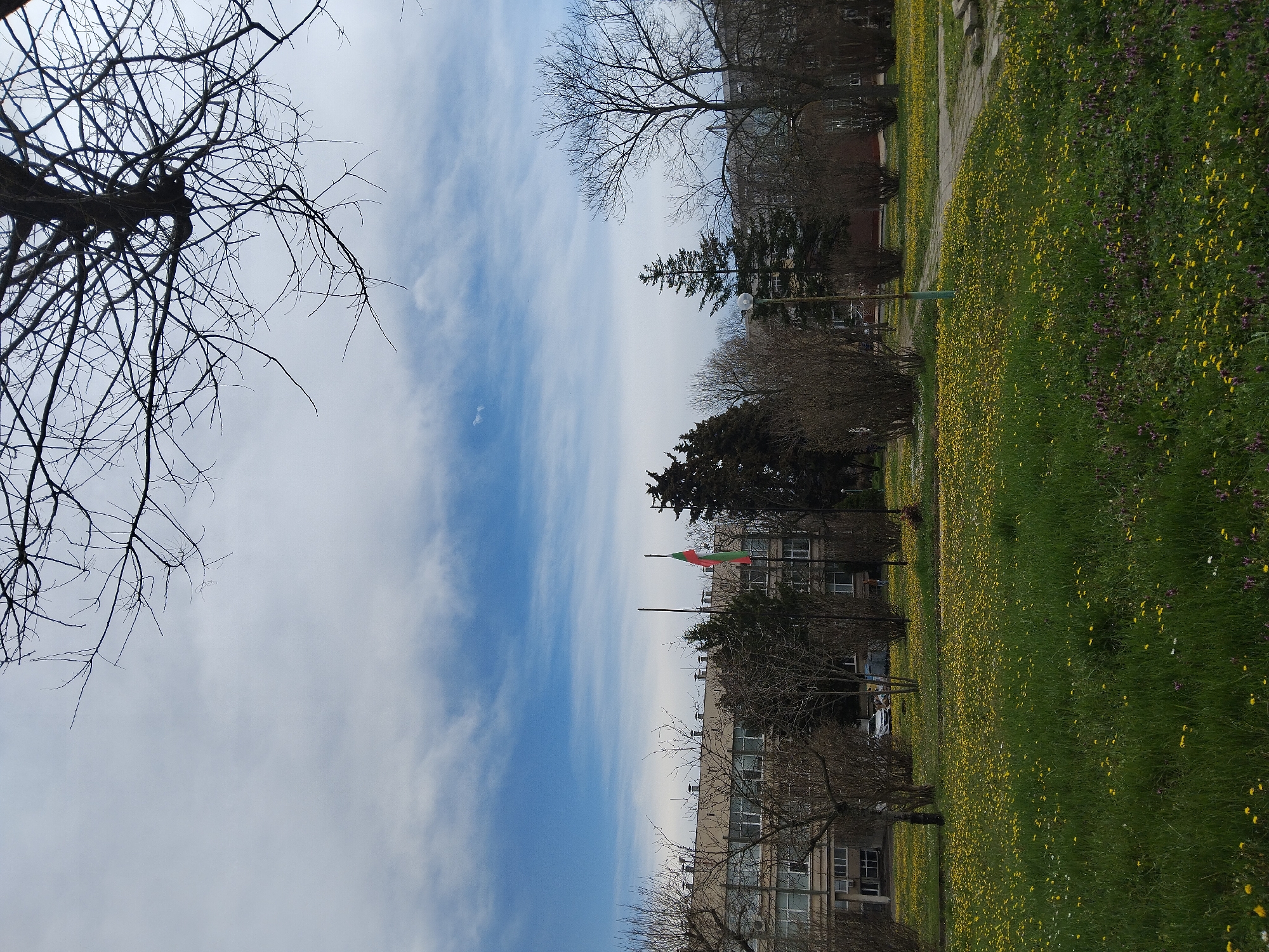 The image depicts an urban green space in Burgas, Bulgaria, under a partly cloudy sky with prominent white clouds against a blue background. The foreground consists of a lawn of green grass extensively covered by yellow dandelions and interspersed with patches of smaller purple flowers. Concrete pathways are visible, winding through the green space. Overhanging bare tree branches are visible in the upper right quadrant and a smaller section of the upper left. In the mid-ground, a flagpole displays the Bulgarian flag, characterized by horizontal white, green, and red stripes. Surrounding vegetation includes a mix of bare deciduous trees, dark green coniferous trees, and dense, leafless shrubs. Multi-story buildings with light-colored facades and numerous rectangular windows define the background. The building on the left features multiple rooftop ventilation units or chimneys. A similar building is positioned further right. A white sedan is partially visible behind shrubbery in the mid-ground, left of center. A singular streetlamp with a white spherical fixture stands on the right. An indistinct human figure is faintly discernible near the building on the right side. No specific actions or interactions are clearly identifiable.