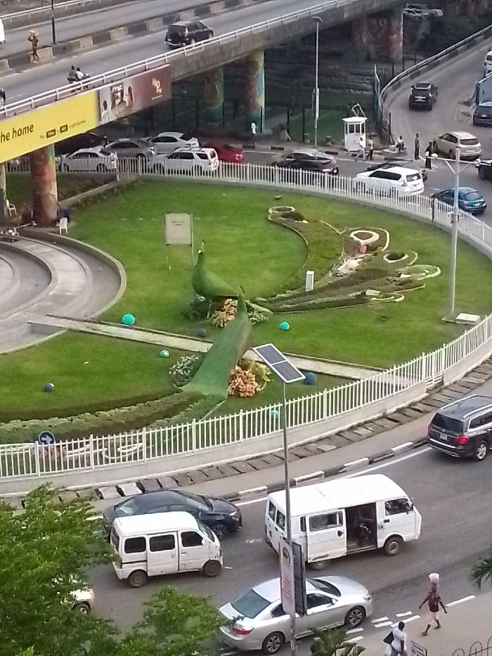 This image captures an elevated view of a multi-level road intersection and roundabout in Falomo, Nigeria. A prominent, circular, green landscaped median dominates the midground, enclosed by a white picket fence. This median features large green topiary sculptures shaped like peacocks, one standing upright and another elongated, surrounded by smaller green shrubs, colorful orange-brown floral arrangements, and several scattered light blue spherical decorations. A small white rectangular sign on a pole and a streetlamp with a solar panel are also present within the median. Multiple asphalt roadways, delineated with white lane markings, encircle the median. Traffic is active on these roads, with various vehicles including white passenger vans (one in the foreground with its side door open), black and silver sedans, and dark SUVs. Several individuals are visible on the sidewalks and road edges; one person in the lower right walks with an item balanced on their head, and other individuals are standing near a small white guard booth positioned adjacent to an upper road segment. An elevated concrete flyover crosses horizontally in the upper portion of the image. Vehicles, including a dark SUV and a motorcycle, are present on this flyover, as are individuals walking on its shoulder, one also carrying an item on their head. Support columns for the flyover are visible, some adorned with murals. Yellow advertising signage is partially visible along the underside of the flyover structure. Urban trees and general city infrastructure frame the scene.