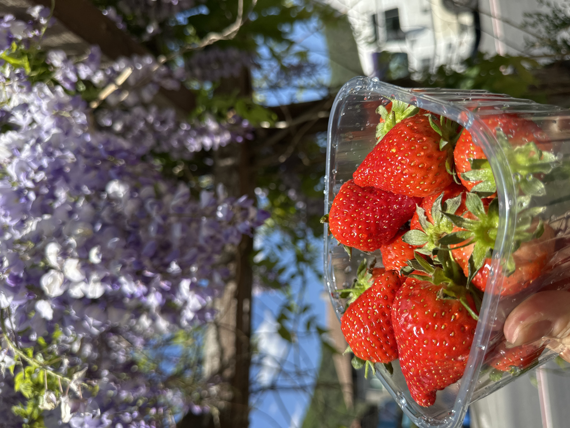 - "A slightly angled close-up depicts a clear plastic container filled with ripe strawberries, held up against a backdrop of blurred purple wisteria blossoms and a partial view of buildings" by FM-hAbta2, licensed under CC BY 4.0