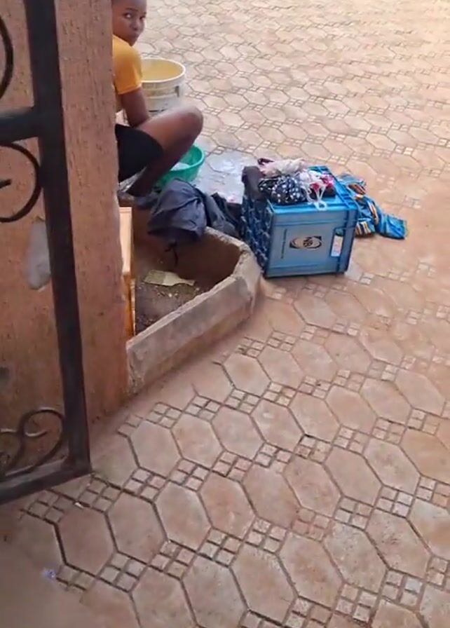 A young woman in a yellow shirt and black shorts squats near a bucket and plastic basin outside on a tiled patio, sorting through clothes. A blue plastic crate sits nearby, holding more clothes. The patio is tiled with a honeycomb pattern. A partial view of a brown wall and wrought iron gate is in the lower left of the frame.