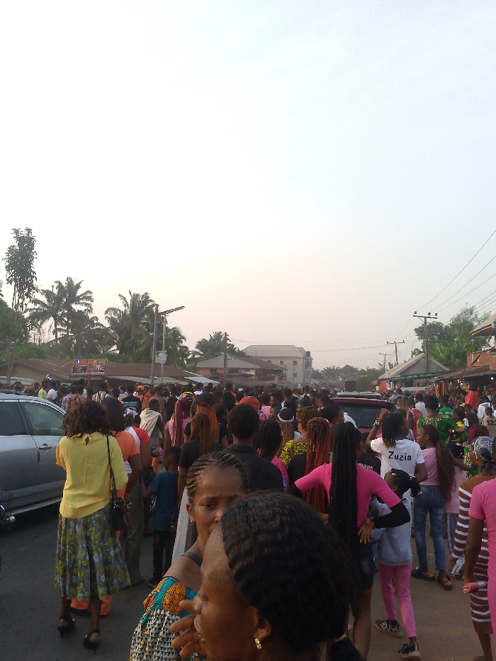 A densely populated street in Alor, Nigeria, is depicted under an overcast or hazy sky