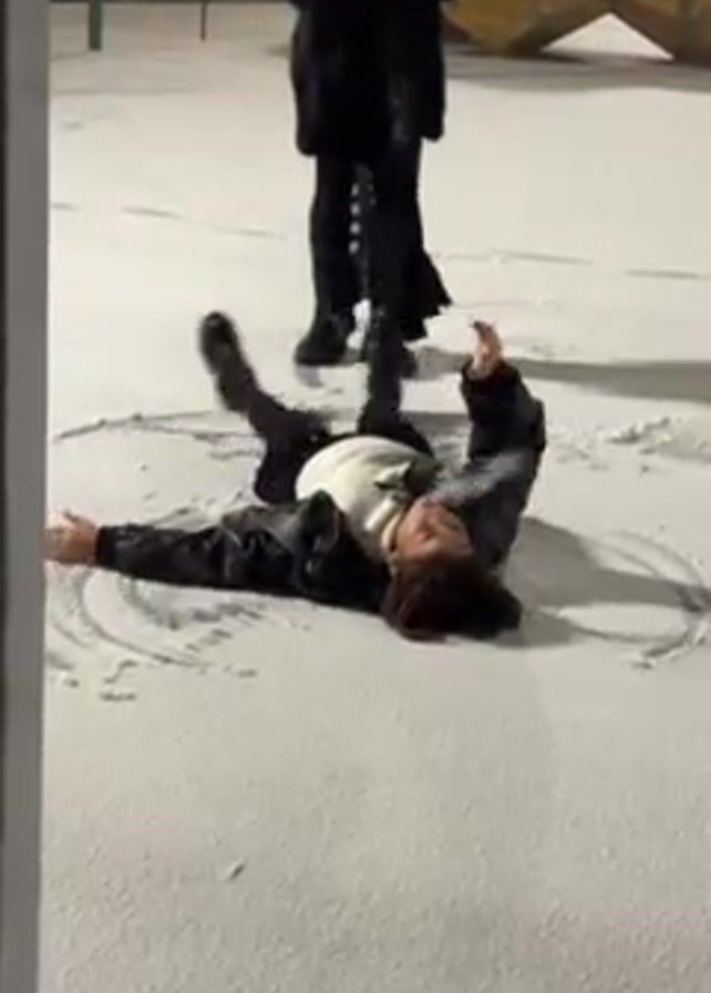 A person is lying on their back in the snow, making snow angels. They are wearing black tights or pants, a white sweater, and a black leather jacket. Another person, wearing a long black coat or dress, is standing behind them watching. The ground is covered in snow and there is a playground in the background.