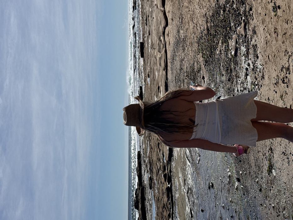 A woman in a white dress and straw hat walks along a rocky beach with the ocean to her left. She holds a small pink object in her right hand and has long, loose hair. The sky is blue with light clouds. The beach is a mix of rock, sand, and seaweed.