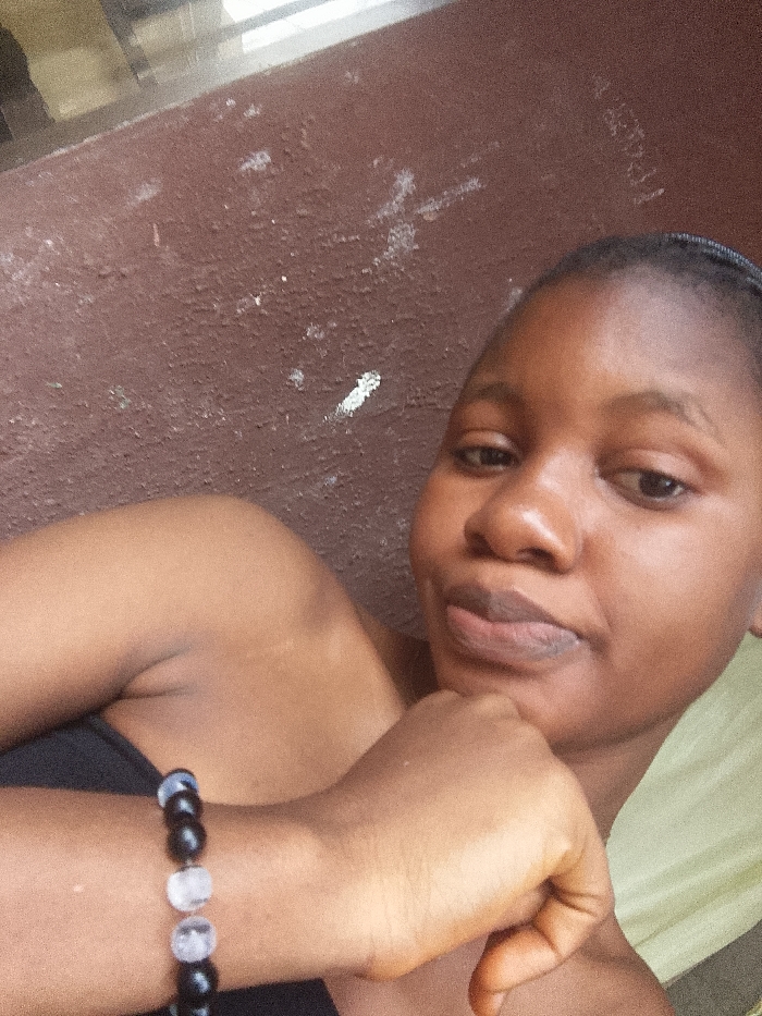 The image displays a close-up, diagonally oriented portrait of a young female in an indoor setting. The subject, appearing to be of African descent, occupies the central and lower portions of the frame, gazing directly at the camera with a neutral expression and slightly parted lips. Her hair is pulled back from her face. She wears a dark-colored, possibly black, strapless or off-the-shoulder garment. On her left wrist, a bracelet composed of alternating black and translucent white spherical beads is visible. Her right hand is positioned beneath her chin. The background is a textured, reddish-brown wall featuring scattered white markings, suggesting wear or paint splatters. A blurred, lighter rectangular area in the upper left corner may indicate a window or light source. A pale green fabric is partially visible in the bottom right corner. No specific visual information within the image definitively identifies the location as Onitsha, Nigeria.
