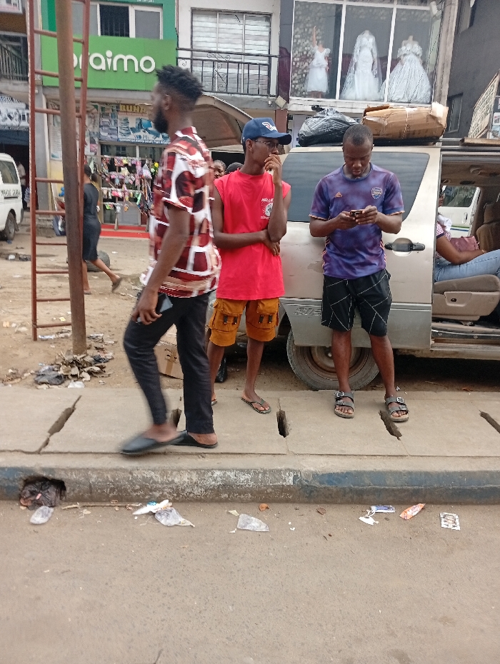 A street scene captures three men standing on a sidewalk beside a parked van. One man in a patterned shirt walks by, while another in a red tank top and blue baseball cap stands with his arms crossed. The third man, wearing a purple shirt, focuses on his phone. Trash litters the curb and street. Behind them, shops display goods, including a wedding dress in a window. A ladder leans against a building in the background.