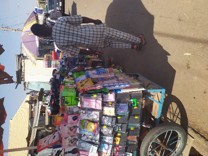 This image captures a bustling outdoor market scene in Jos, Nigeria, under clear, bright daylight. In the immediate foreground on the left, a mobile vendor cart with a blue metal frame and a single visible spoked wheel is laden with a dense display of merchandise. The cart primarily features packaged electronic accessories, including numerous phone cases of various colors and designs, headphones, USB cables, and power adapters, many in green and other colored boxes, all arranged in clear plastic packaging. In the midground, a person, viewed from behind, walks away from the camera toward the right side of the frame. This individual is dressed in a matching checkered (plaid) short-sleeved top and trousers, predominantly white with a dark grid pattern, and wears brown, patterned open-toed sandals. Their distinct shadow stretches across the light-colored, paved ground. The background features a collection of market stalls and structures. On the left, several buildings with corrugated metal roofs, one appearing light tan, are visible. Two individuals stand on the roof of one of these structures. Towards the center-right, a white-walled building and a purple and white striped market umbrella provide shade. Further down the street, other pedestrians and a dark-colored vehicle are partially visible, indicating active commerce and traffic. The sky above is clear and light blue.