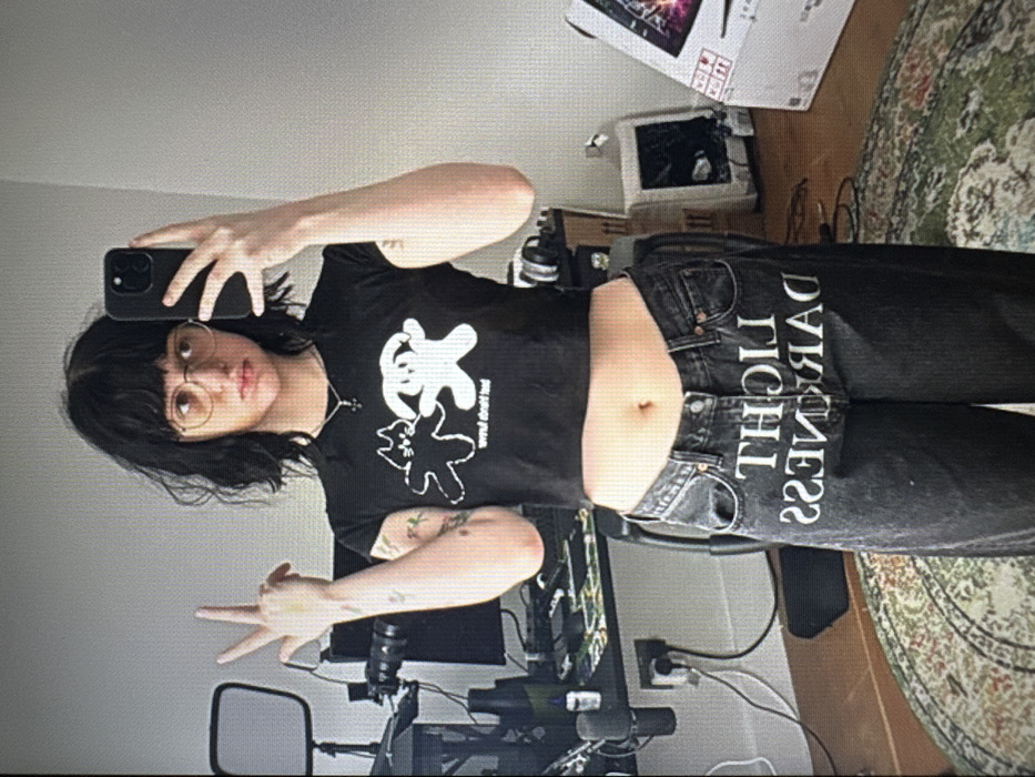 A person is depicted indoors, in a residence located in Jos, Nigeria, taking a mirror selfie. The individual has short, dark, wavy hair with bangs, wears round-frame eyeglasses, and appears to be of light complexion. They are wearing a black short-sleeved crop top featuring two white cartoon figures and reversed white text on the chest, exposing the navel. Their lower attire consists of faded black wide-leg jeans with prominent, reversed white text spelling "LIGHT DARKNESS" across the upper thighs. The left hand is raised, displaying a 'V' sign with the index and middle fingers extended. The right hand holds a dark-colored smartphone, positioned to capture the image, partially obscuring the right side of the face. The background on the left reveals a desk setup including a black computer monitor, a boom arm with a microphone, a small black bottle, and cables connected to a power outlet on a light-colored wall. A square LED ring light on a stand is also visible. On the right, a white wall, a damaged electronic device (possibly a monitor) resting on the floor, and a white cardboard box are present. The floor is covered by a round rug with green, cream, and brown patterns, surrounded by a light-colored wooden floor.