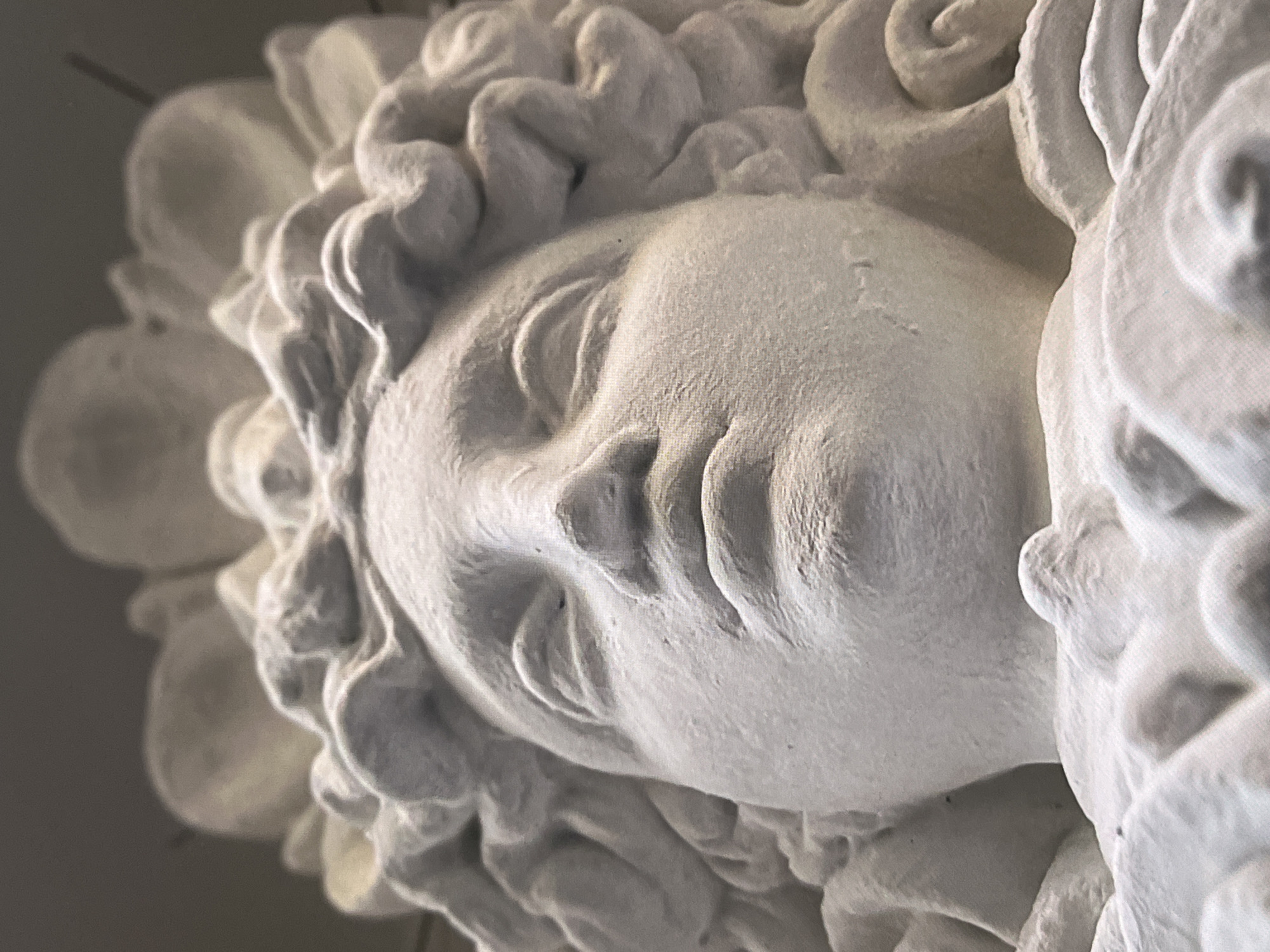 The image displays a low-angle, close-up view of a white, carved architectural bust depicting a female figure