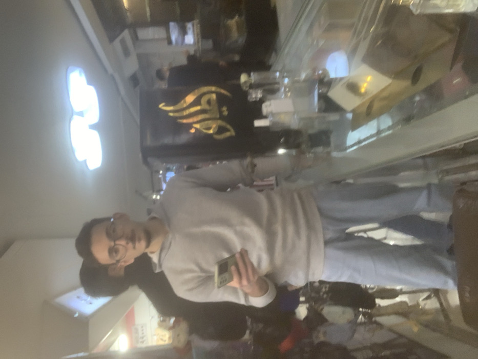 A person wearing glasses, a light gray sweatshirt, and light blue jeans stands indoors. They are holding a small, rectangular device in their right hand. In the background, there's a black sign with gold Arabic writing, and a display counter with various items, possibly perfume bottles. Additional people are seen in the background, and the lighting in the room is somewhat bright.
