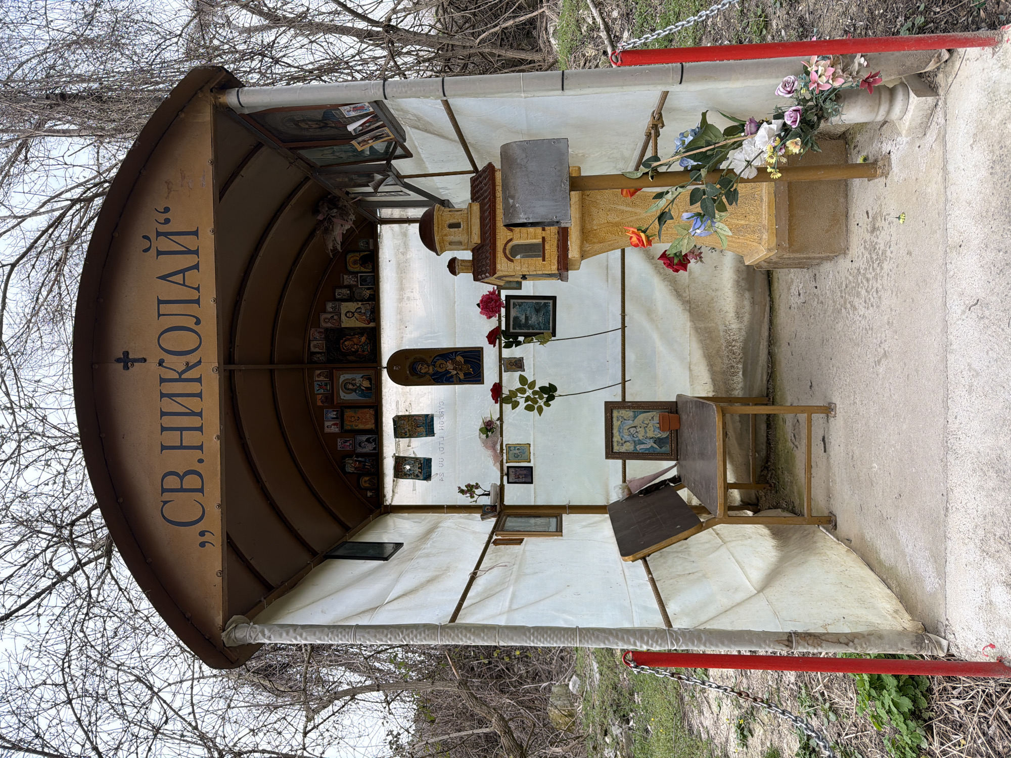 The image displays a small, open-fronted religious shrine located in the city of Kavarna, Bulgaria. The structure features an arched, corrugated brown metal roof with the Cyrillic inscription "„СВ. НИКОЛАЙ“" (Saint Nicholas) and a cross symbol centered on its facade. The side and rear walls are constructed from white canvas or tarp, secured to a frame. Inside the shrine, a grey concrete slab forms the floor. On the left, a simple dark-stained wooden bench with a backrest is present, holding a small terracotta pot. The rear and right interior walls are densely adorned with numerous framed Orthodox Christian icons depicting saints and the Virgin Mary with Child, intermingled with smaller framed pictures, some appearing religious and others potentially personal. Artificial floral arrangements, predominantly red roses and mixed bouquets, are placed on ledges and in vases on the floor. On the right side of the interior, a yellow-colored pedestal supports a detailed miniature church model featuring a dome and red roof tiles. Below this model, an unpainted metal mailbox-like receptacle is attached to a vertical pole extending from the pedestal. The immediate exterior of the shrine's entrance is bordered on the left by a red-painted post connected to a metal chain that extends further left. The surrounding environment consists of unkempt ground with patches of sparse grass and dry vegetation. The background is dominated by a dense arrangement of bare, deciduous tree branches and vines under an overcast sky, suggesting a non-growing season. No people are visible, and no actions or interactions are depicted.