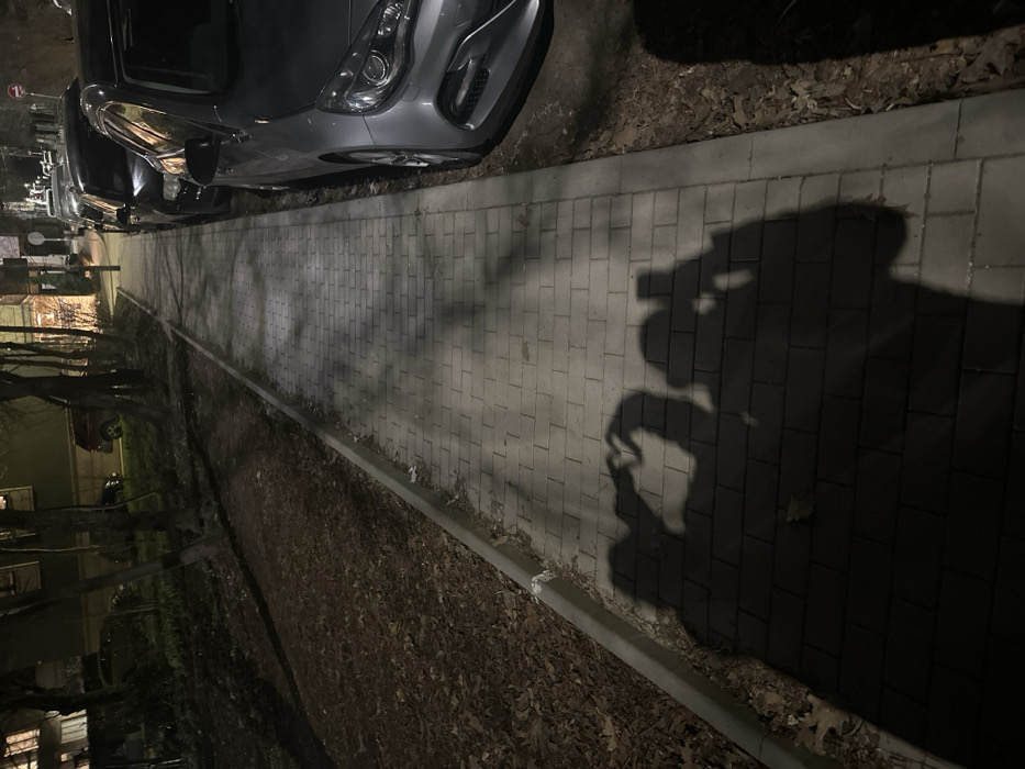 The image depicts an urban street scene at night in Sofia, Bulgaria, illuminated by artificial light sources. The foreground features the distinct, elongated shadows of two individuals cast onto a light grey, brick-patterned sidewalk. The shadow on the left and the shadow in the middle collaboratively form a heart shape with their silhouetted hands. The shadow on the right appears to be holding an object resembling a smartphone, suggesting the photograph is a self-portrait of the shadows. To the left of the sidewalk, a concrete curb separates it from an unkempt strip of bare ground covered with a dense layer of dry, fallen leaves and dirt. Beyond this strip, several deciduous trees with bare branches are visible, and further back, the illuminated windows of buildings indicate a residential or mixed-use area. To the right of the sidewalk, a line of parked vehicles extends into the distance. The closest vehicle is a silver or light grey hatchback, facing away from the viewer, with its front bumper, grille, and headlights visible. Other darker colored cars are parked consecutively behind it. Overhead, indistinct reflections or shadows of tree branches are visible on the sidewalk surface. The overall environment suggests a typical city street during evening hours.