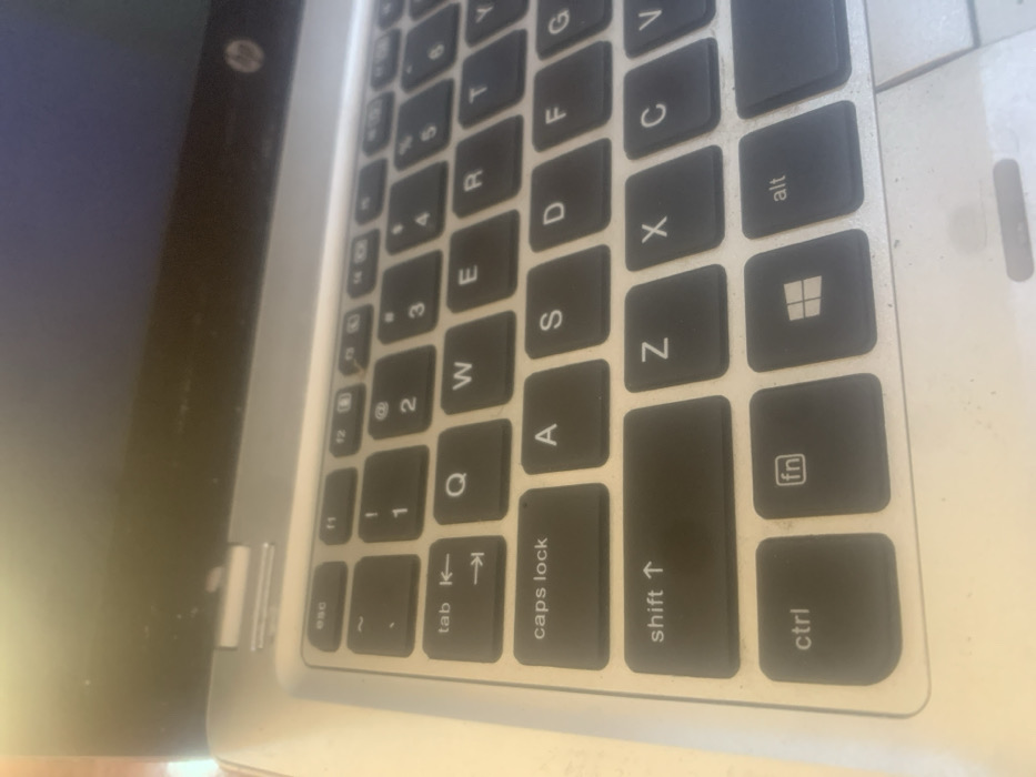 This scene is set in Gusau, Nigeria. The image displays a close-up, angled view of an open silver-colored HP laptop. The perspective is from the lower-left, looking across the keyboard towards the screen. The laptop's dark gray QWERTY keyboard is prominently featured, showing keys such as 'esc,' 'tab,' 'caps lock,' 'shift,' 'ctrl,' 'fn,' 'Windows key,' 'alt,' and the 'QWERTY,' 'ASDFG,' and 'ZXCV' rows. The entire visible surface of the laptop, including the keys and palm rest, shows a noticeable accumulation of dust and fine particulate matter. The upper portion of the laptop screen is visible, dark with a slight bluish tint, and exhibits faint reflections or smudges. An 'hp' logo is discernible on the screen's lower bezel, towards the right side. No individuals, direct actions, or specific environmental details beyond the laptop are visible.