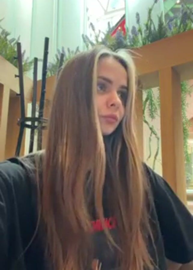 A young woman with long, light brown hair and a blonde streak sits at a table in what appears to be a food court or restaurant. She wears a black t-shirt with red text. She looks directly at the camera, then glances to the right. The background features wooden panels, greenery, and a skylight. A black chair is visible behind her.