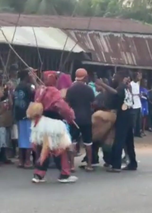 The video depicts a crowded street scene in what appears to be a village or rural area, likely in Africa. A group of people are gathered around several individuals in elaborate traditional costumes, possibly masquerades or performers in a cultural ceremony. The costumes are colorful and feature elements like raffia skirts and masks. Some people in the crowd are taking pictures or videos with their phones. The background includes simple buildings with corrugated metal roofs and lush tropical foliage. The overall atmosphere suggests a festive or celebratory occasion.