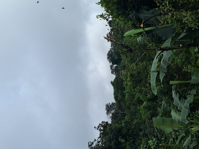 A dense, green forest occupies the lower portion of the image, lush with varied trees and large banana leaves. Above the forest canopy, a gray, overcast sky dominates. Two birds are visible against the sky. The image is shot from a low vantage point, looking upwards towards the trees and sky.