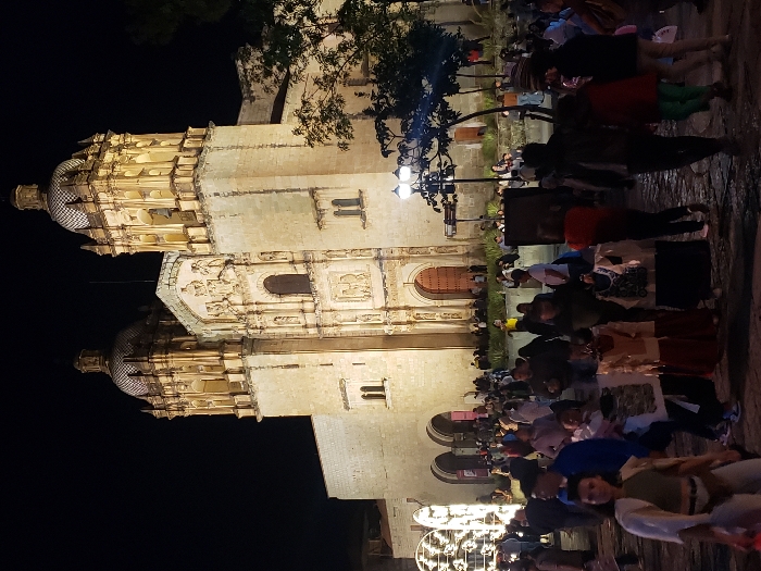 A nighttime view of a grand, ornate church, likely European in style, illuminated with warm lighting against a dark sky. People are milling about in front of the church, suggesting a public space. Street lamps and architectural details add to the scene's ambiance. The perspective is somewhat unusual, possibly taken from a low angle or rotated.